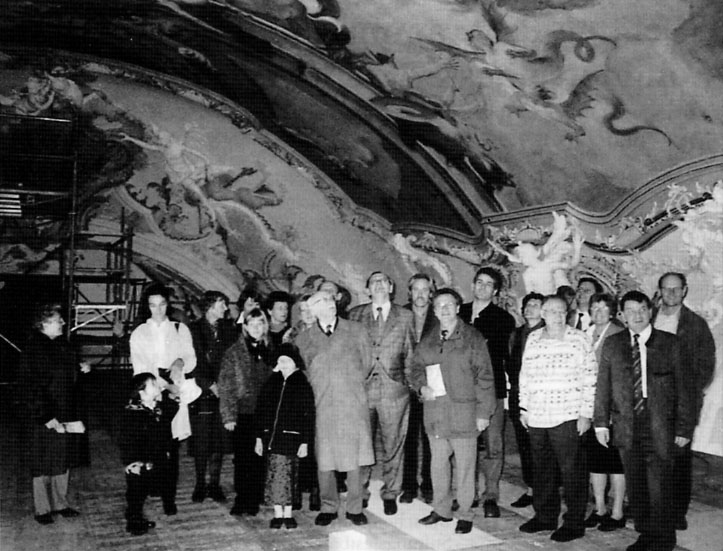 Natürlich beeindruckte die von Bb. Albrecht genannte Zahl von 15 Millionen Sanierungskosten, eventuelle Zweifel an deren Vertretbarkeit wurden aber spätestens zunichte, als man das Gerüst bestieg und nun aus ganz ungewohnter, unmittelbarer Nähe die herrlichen und im Grunde gut erhaltenen Deckengemälde des Tiroler Malers Johann Jakob Zeiller bewundern konnte, deren Dimensionen eine gute Fernwirkung garantieren, deren feine Ausführung aber auch in der Nahsicht beeindruckte. Kein Wunder, dass die unmittelbare Nachbarschaft gemalter Engel und Heiliger einer Besucherin das Bonmot entlockte: "Da sind wir ja schon im Himmel!" Der Laie fragte sich auch, wie der Maler, der ja in dieser kurzen Entfernung von seinem Gegenstand arbeiten musste, überhaupt in der Lage war, die Gesamtproportionen seiner umfangreichen Darstellungen so sicher zu disponieren.